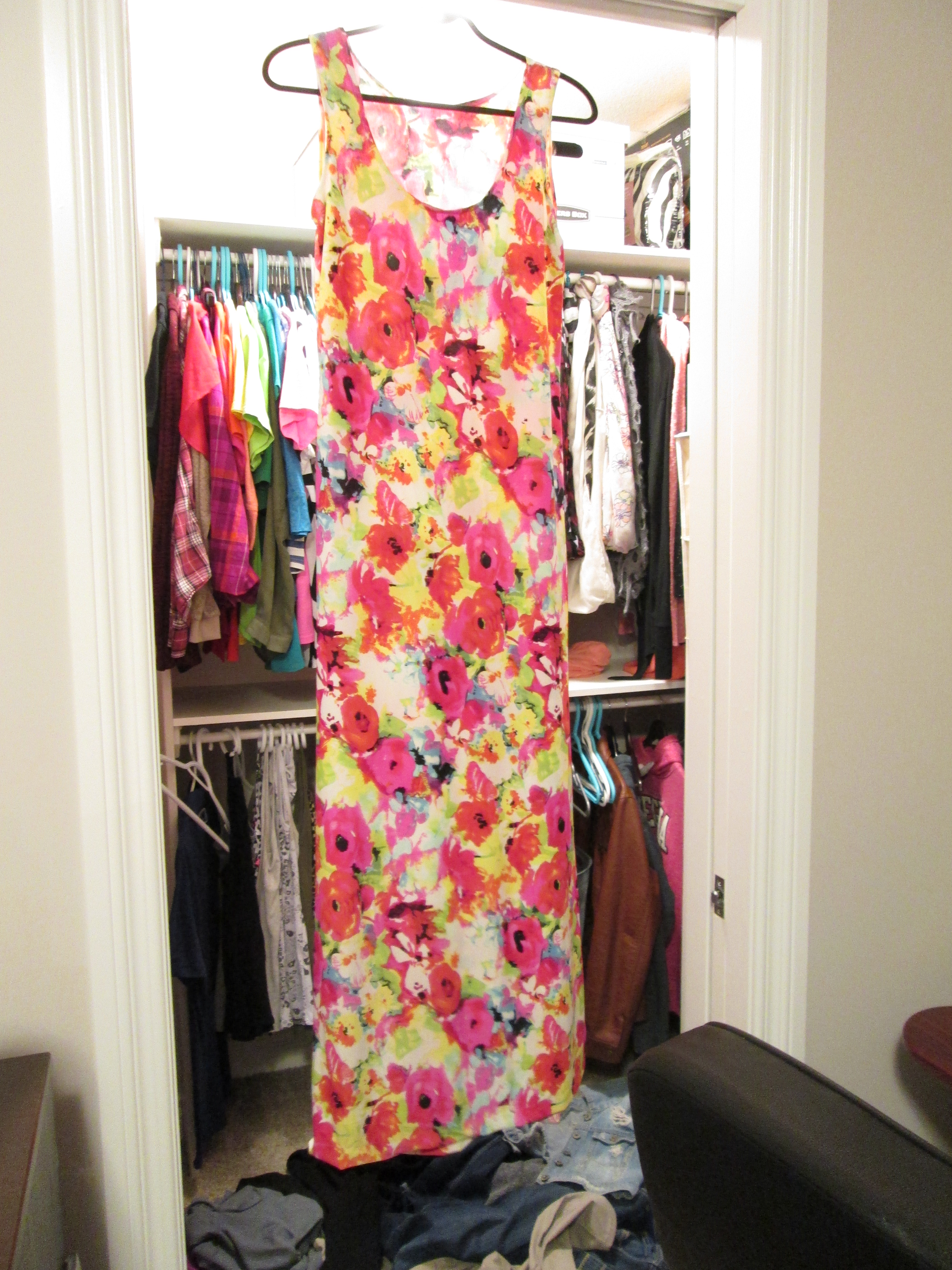 To finish my dress, I had three things left to do: 1) pin and sew the bottom of my dress so that It looked nice and was custom to my height, 2) pin and sew around the neck and arm holes to make the dress look polished, and 3) try on the dress and admire my work.