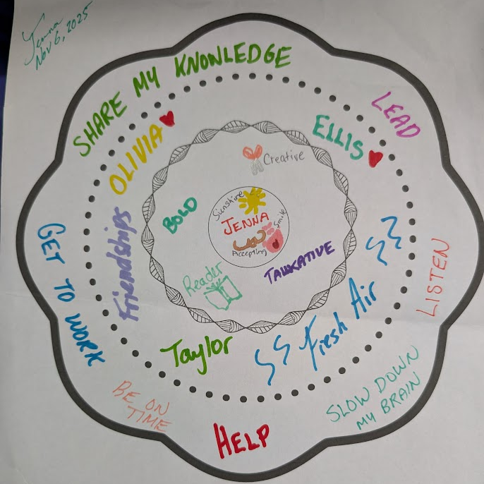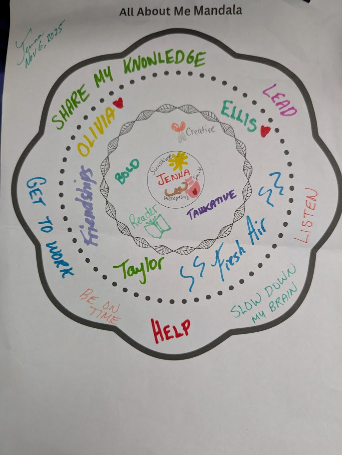 On November 6th, a classmate named Averie, presented her visual representation activity to encourage students to represent themselves in an art format. The all about me Mandela art piece was both informative and relaxing, as seen in the picture below.